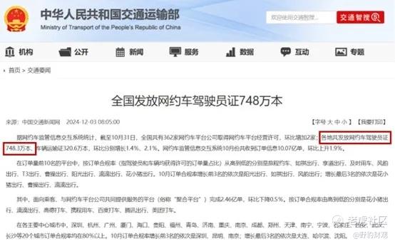 交通运输部数据显示,截至2024年10月31日,全国持证网约车驾驶员数量已达748.3万人。同时,一线城市网约车渗透率超过80%,运力过剩、司机收入腰斩成为常态。