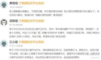 在黑猫投诉平台,关于花小猪的投诉多达数千条,内容涵盖司机拒载、恶意收费、幽灵订单等,甚至有用户开设“花小猪维权”专栏,吐槽客服响应慢、维权难。