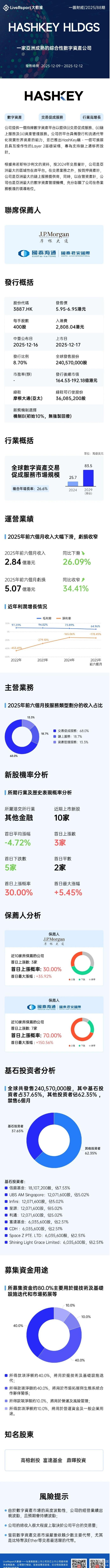 12月9日,HASHKEY HLDGS(3887.HK) 开启招股,招股日期为2025年12月9日至2025年12月12日,并预计于2025年12月17日在港交所挂牌上市,联席保荐人为摩根大通、国泰君安。