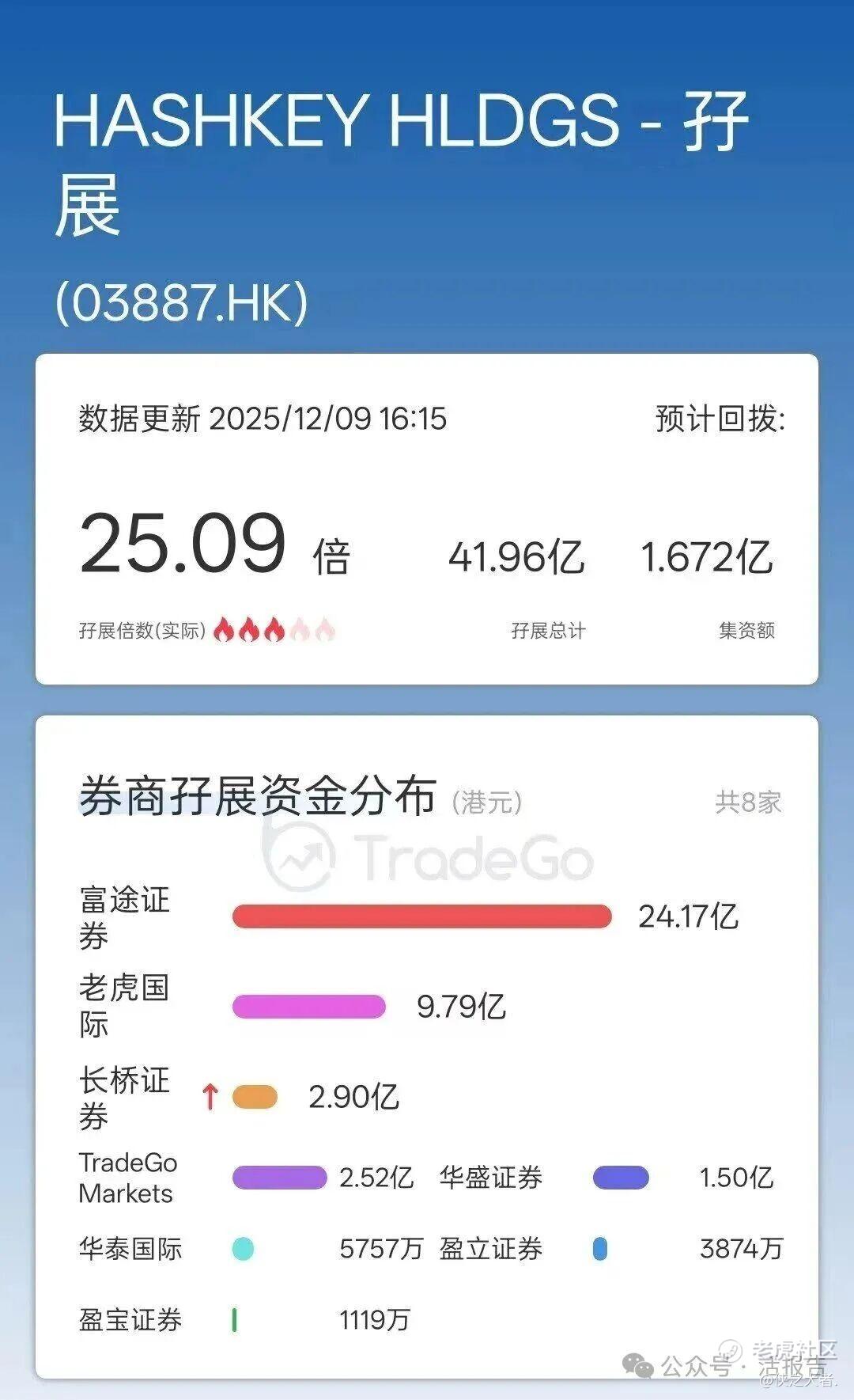 据TradeGo新股孖展数据,截至12月9日16时,HASHKEY HLDGS的孖展总额约41.96元,孖展认购倍数约25.09倍。其中,富途证券、老虎国际、**证券分别放出24.17亿、9.79亿、2.90亿港元孖展。