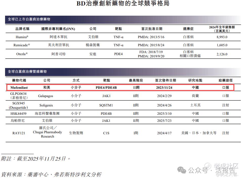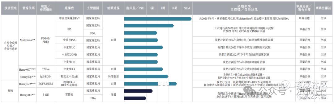 Mufemilast,是一种自主研发的小分子PDE4B表达阻断剂和PDE4抑制剂,具有广泛的自身免疫性疾病治疗潜力。根据弗若斯特沙利文,Mufemilast是一种具有双重作用机制的全球药物。Mufemilast已获准于中国商业化,用于治疗中重度斑块状银屑病(Ps)。目前,Mufemilast亦正就针对白塞病(BD)的关键性III期试验接受审评。公司已完成针对强直性脊柱炎(AS)的II期试验,针对溃疡性结肠炎(UC)、特应性皮炎(AD)、银屑病关节炎(PsA)、克罗恩病(CD)及慢性阻塞性肺病(COPD)的其他试验正在进行中或计划开展。该产品已就BD获FDA授出孤儿药资格认定。
