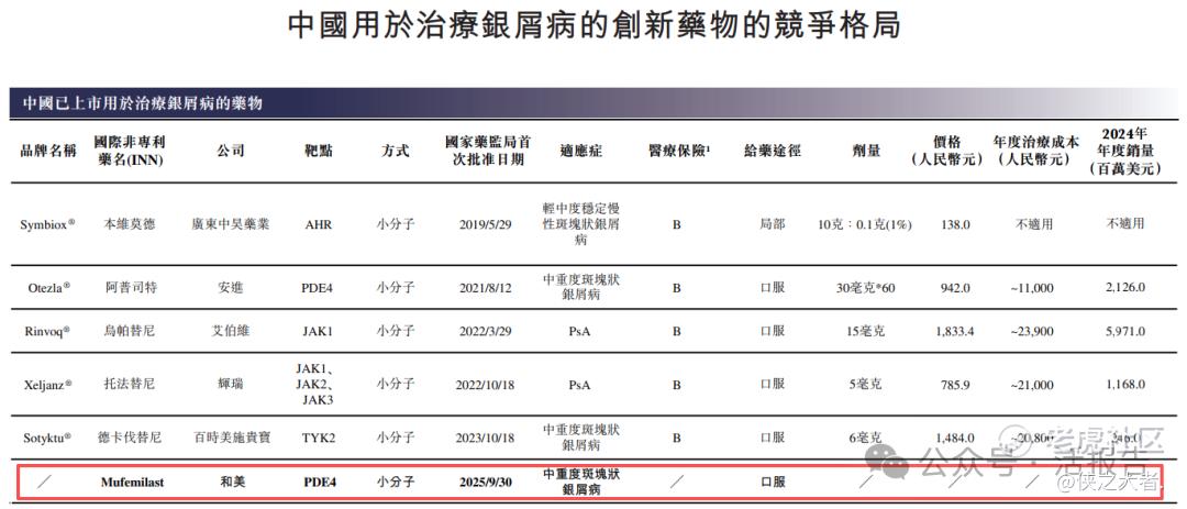 截至最后实际可行日期,中国有17种获批治疗银屑病的靶向药物,包括5种小分子药物和12种生物制剂。这些疗法包括与Mufemilast靶点相同的阿普司特、靶向TNF-α的阿达木单抗等药物,部分药物已在头对头临床试验中展现出优于阿普司特的疗效。