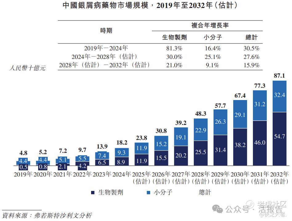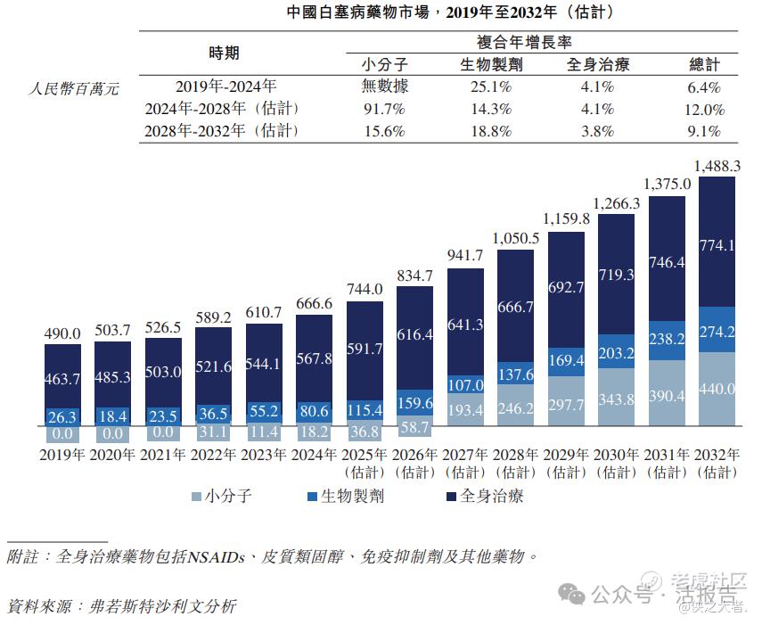 根据弗若斯特沙利文(Frost & Sullivan)的报告,中国银屑病药物市场规模在2024年达到人民币182亿元,2019年至2024年的复合年增长率为30.5%。预计到2028年市场规模将增至人民币483亿元,2032年达到人民币871亿元。
