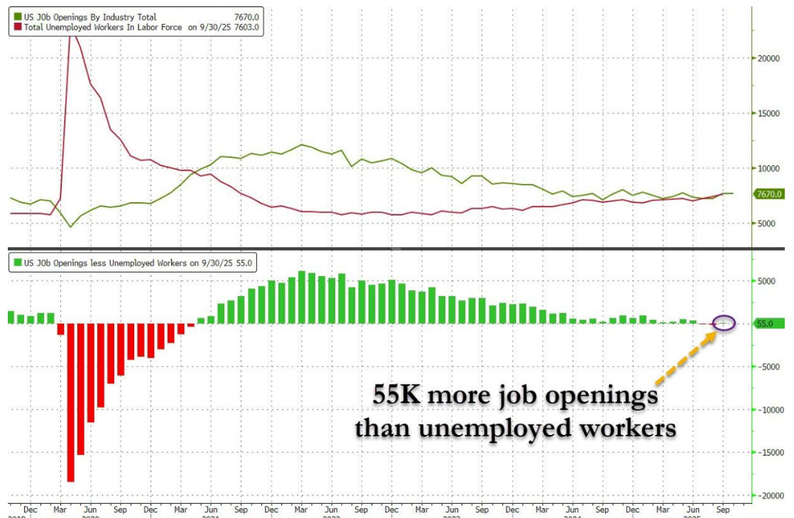 而目前10月份的职位空缺比失业人数多出5.5万个。这意味着长期存在的空缺职位少于失业人数的现状被再次扭转。值得注意的是,美国经济从来没有在职位空缺多于失业人数的情况下陷入过经济衰退。