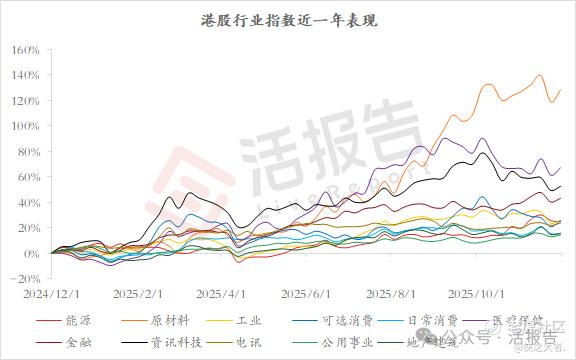 行业方面,得益于黄金等大宗商品的走牛,港股原材料行业自9月份以来持续表现强势,年内累涨134%领跑市场;其次是医疗保健、资讯科技、金融行业,分别累涨74%、40%、36%;日常消费、公用事业及地产建筑行业则表现弱势。