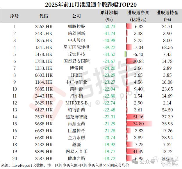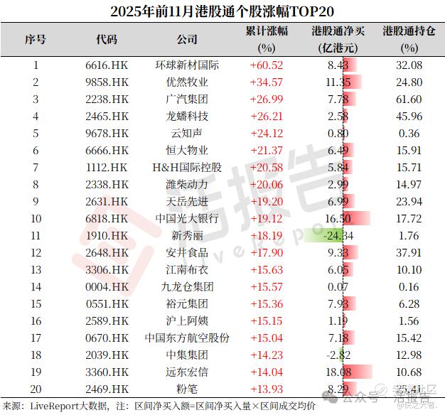 今年前11月,港股通表现居前的个股包括环球新材国际、优然牧业、广汽集团、龙蟠科技、云知声等,其中环球新材国际年内累涨超60%,南向资金净买入约8.43亿港元,持仓占比达32%。