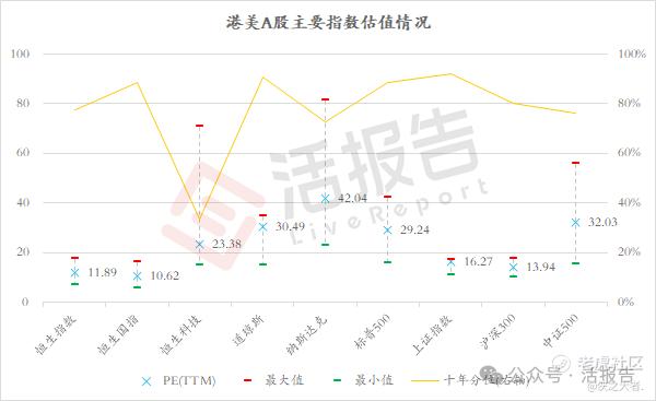 市场风险偏好降温的情况下,港股科技股回调幅度较大。截至11月底,恒指、国指、恒科的PE估值分别为11.89x、10.62x、23.38x,分别位于近十年77.5%、88.3%、33.4%的历史分位,仍处于全球主要指数中的较低水平。