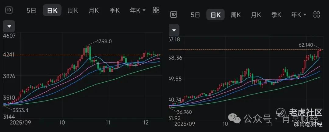 黄金自10月中旬调整后,一直没破前高,整体上还是处于震荡趋势;白银也是10月中旬开始调整,但现在已经破了前高,截止发文已经62了,走出了上升趋势。