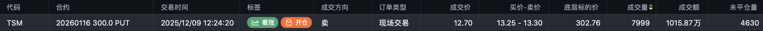 跟英伟达一样有大单sell put,行权价选择了平价300$TSM 20260116 300.0 PUT$ ,成交量7999,成交额1015万美元。