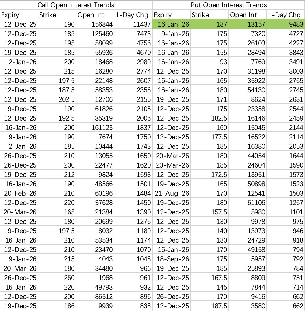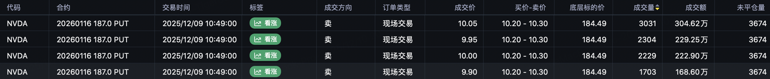 有大户为H200事件布局了罕见价内sell put: $NVDA 20260116 187.0 PUT$ ,成交额约1000万,期权开仓是9483手。