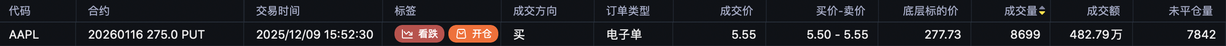 苹果有看跌大单开仓:$AAPL 20260116 275.0 PUT$ ,成交量8699手,成交额482.79万美元。