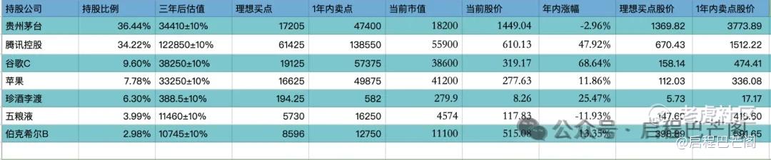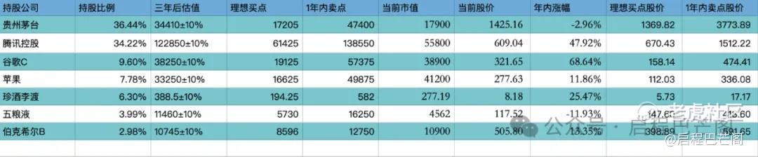 目前十大持仓:贵州茅台36.44%,腾讯34.22%,谷歌9.60%,苹果7.78%,珍酒李渡6.30%,五粮液3.99%,伯克希尔2.98%。目前九大持仓占比88%(其中科技股占比51.6%,白酒股占比46.7%;A股占比40.43%,港股占比40.52%,美股占比20.36%),还有12%观察仓和现金。
