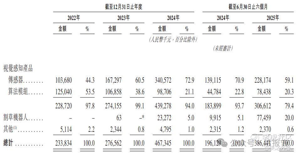 公司的收入主要来源于销售视觉感知产品和割草机器人。2024年,搭载公司的视觉感知技术的智能机器人数量超过600万台。第一代智能割草机器人于2024年成功实现量产,并于量产首年实现第一代智能割草机器人销售突破10,000台。2024年公司割草机器人营收占比为5%。