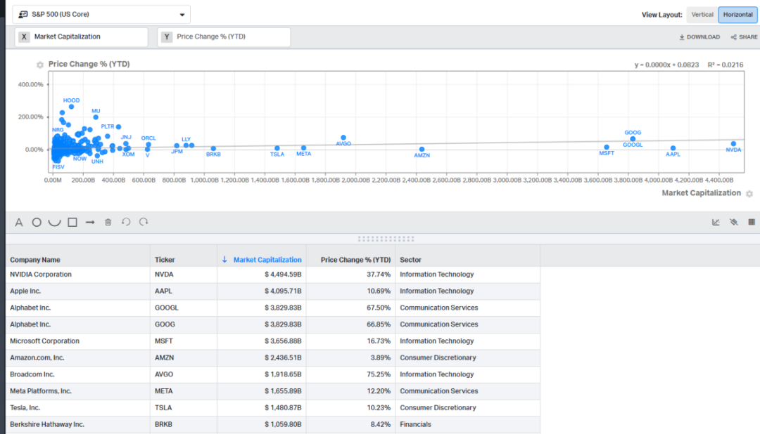 截至2025年12月9日,标普500指数年内录得16.3%的可观涨幅,整体表现强劲。然而,这背后的动力并非来自整个市场的“雨露均沾”,而是呈现出极度集中的“头部效应”。