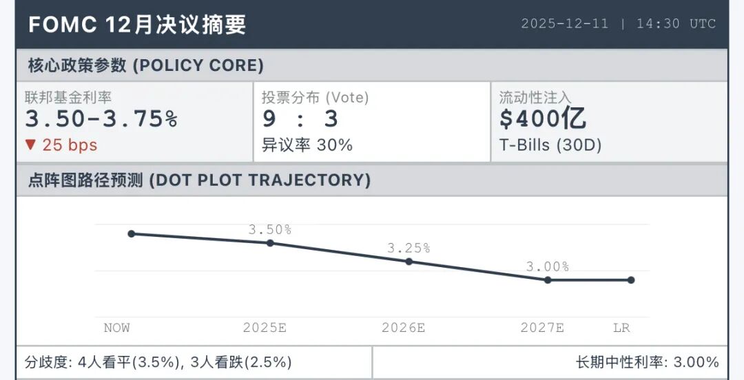 值得注意的是,FOMC内部分歧同样显著:4位委员认为明年无需降息,而3位则主张降至2.50%,点阵离散度达到2023年中以来最高水平。