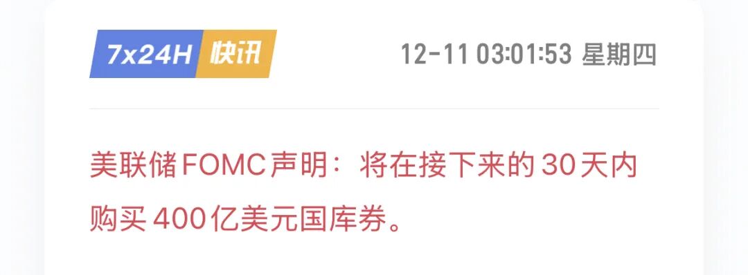 真正值得关注的是声明中披露的流动性操作:Fed将于12月12日起30天内购入最高400亿美元短期国债,以确保银行体系储备充裕。
