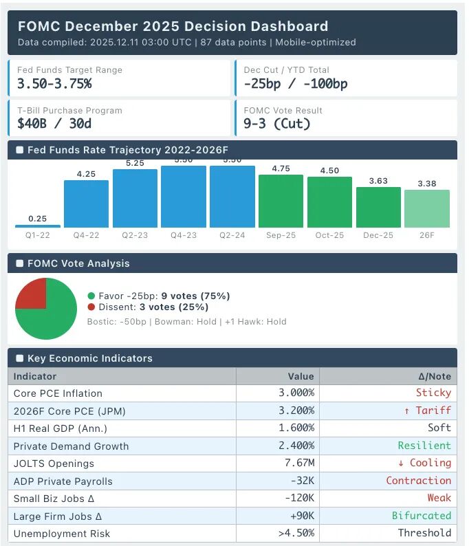北京时间12月11日凌晨,美联储如期宣布降息25个基点,将联邦基金利率目标区间下调至3.50%-3.75%,这是2025年内第三次降息,累计降幅达100个基点。