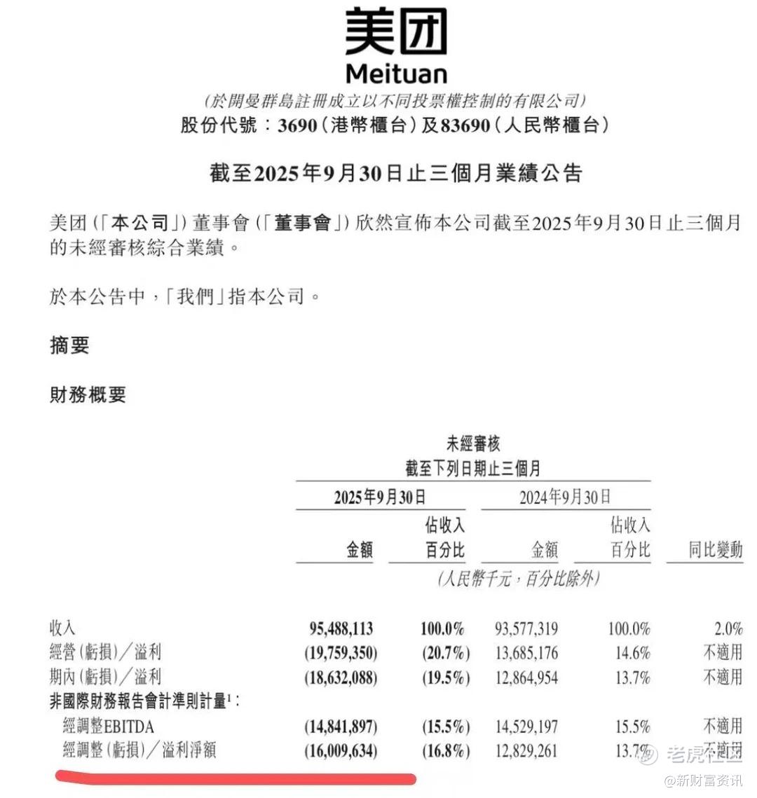 2025年11月28日,美团发布2025年第三季度财务报告,955亿元的营收规模与160亿元的经调整净亏损形成鲜明对比,市场对此呈现分化解读。然而深入拆解财报数据与业务动态后不难发现,本季度的亏损本质是行业竞争峰值下的战略性投入,核心业务的用户根基与场景壁垒反而持续夯实。结合港股市场整体环境,美团的至暗时刻已逐步消退,当前节点具备关注加仓价值,但需警惕大盘波动带来的阶段性风险。