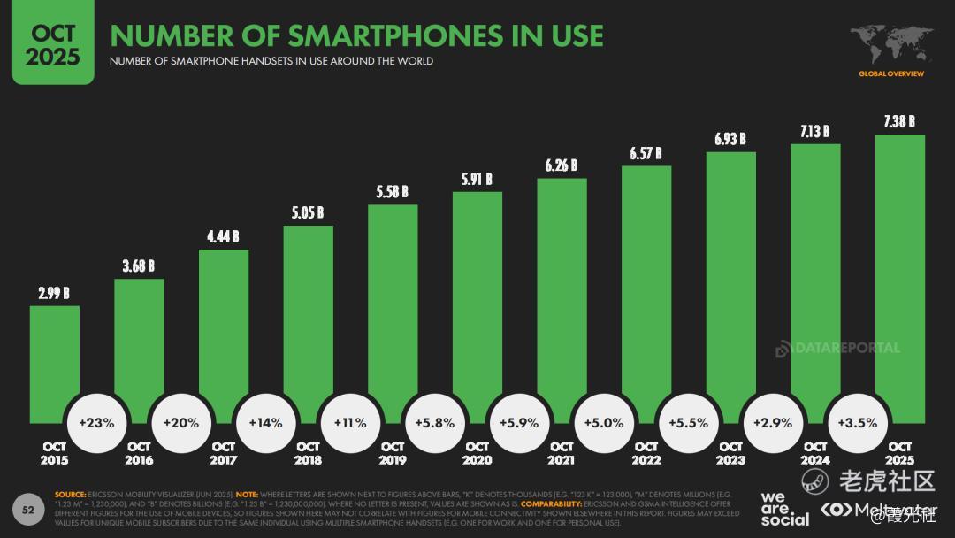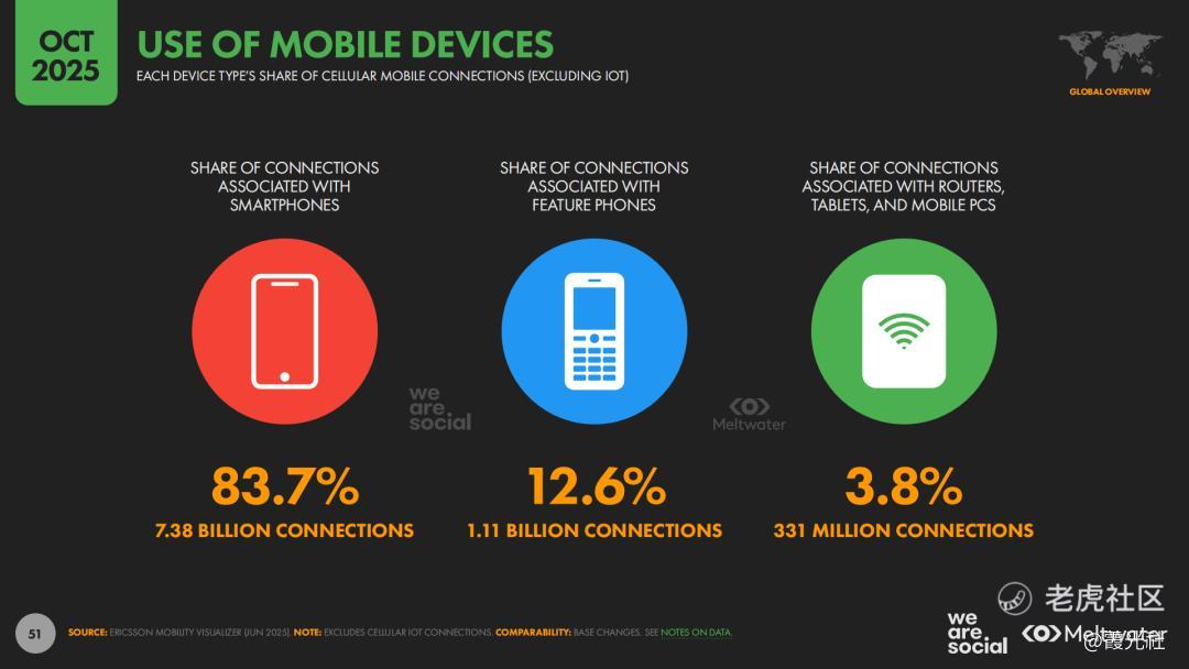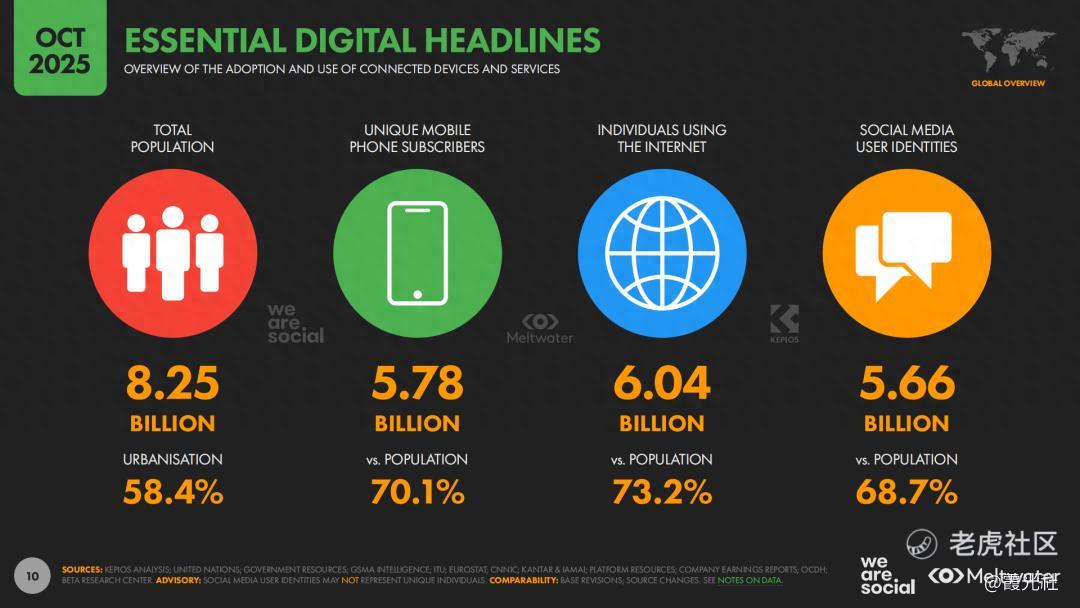 全球数字空间,正在悄然改写企业“走出去”的底层逻辑。近日,Meltwater与We Are Social联合发布的《Digital 2026 Global Overview》(下称“报告”)显示,截至2025年10月,全球人口约82.5亿,其中移动电话用户约57.8亿,互联网用户约60.4亿,社交媒体用户约56.6亿,对应渗透率分别为70.1%、73.2%和68.7%。同时,全球互联网用户同比增长5.1%,社交媒体用户同比增长4.8%,96%的网民通过移动设备上网,智能手机用户数约73.8亿,移动互联网已经成为真正意义上的“默认入口”。