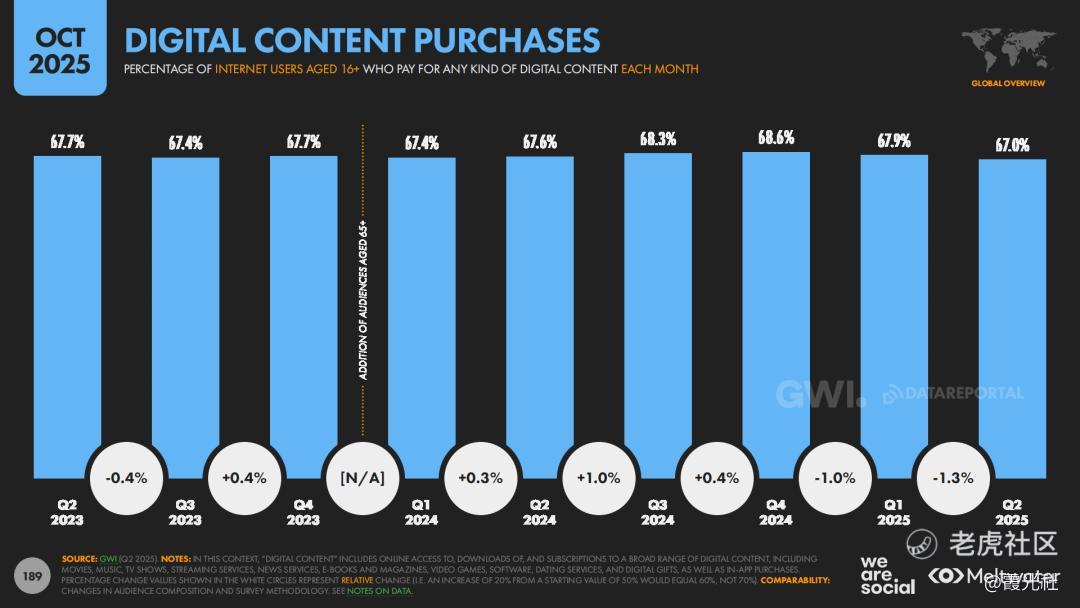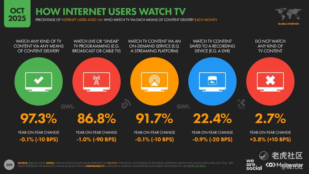 内容消费层面,流媒体与短视频共同构成了全球注意力的“新底盘”。报告显示,91.7%的互联网用户每月会观看流媒体电视内容。同时,TikTok、Reels等短视频平台的观看时长持续攀升,形成“短视频种草”加“长视频陪伴”的复合消费路径。