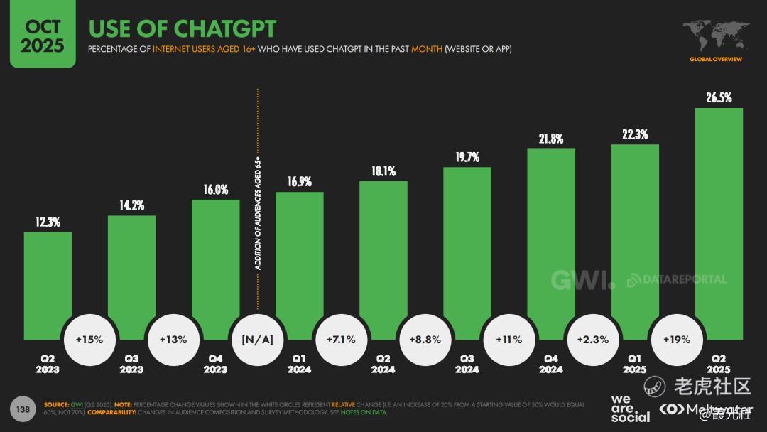 在技术层面,报告最醒目的关键词无疑是人工智能,尤其是生成式AI的迅猛扩张。报告显示,ChatGPT已成为全球增长最快的数字应用之一,使用ChatGPT的互联网用户占比不断增加,生成式AI工具的月度使用人群总体规模已迈入“十亿级”。更重要的是,AI使用场景正在全面渗透日常生活:从最初的写作辅助、学习辅导,扩展到情感陪伴、生活规划、工作决策等多个领域。AI正在从“极客工具”变成面向大众的“数字生活助手”。