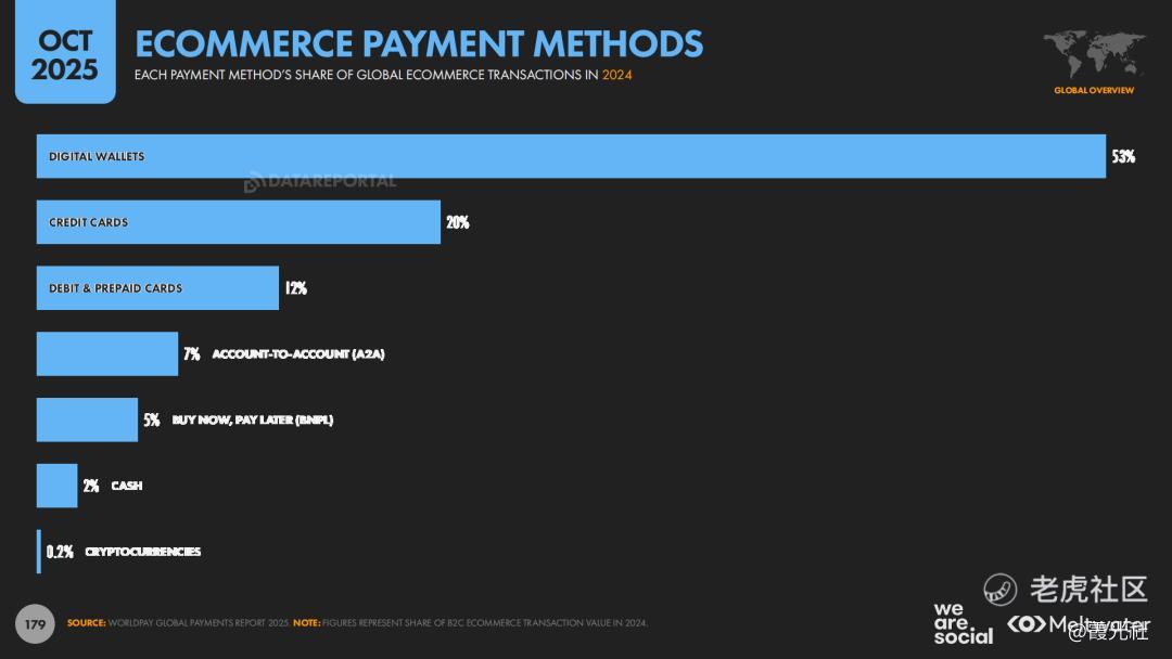 在驱动因素上,价格和履约体验仍然是用户线上购物的主要考量。与此同时,数字支付的基础设施也在迅速夯实。报告指出,约53%的电商交易通过数字钱包完成,约有1/4的全球网民每月使用移动支付服务。这表明,数字钱包正在取代传统银行卡成为主流支付方式。