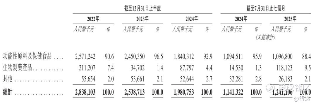 石药创新2025年前7个月来自功能性原料及保健食品的收入为11亿元,占比为88.4%;来自生物制药产品的收入为1.18亿元,占比为9.5%。