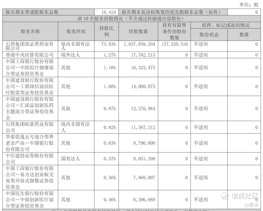 截至2025年9月30日,石药集团恩必普药业有限公司持股为73.83%,香港中央结算有限公司持股为1.27%,中国工商银行股份有限公司-中欧医疗健康混合型证券投资基金持股为1.16%,中国建设银行股份有限公司-工银瑞信前沿医疗股票型证券投资基金持股为1%;