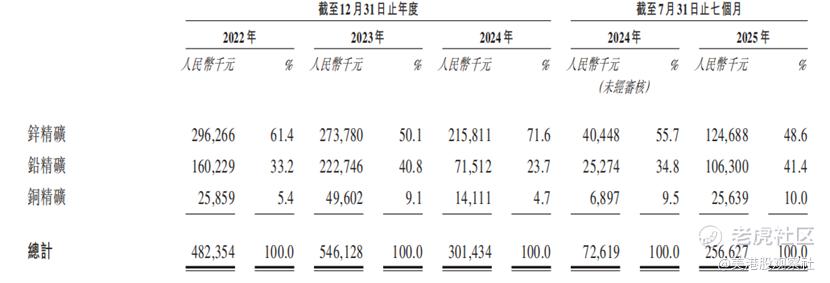 从收入结构来看,公司收入高度集中于核心精矿产品,且锌精矿为主要收入来源。2022年至2024年及2025年前七个月,锌精矿收入分别占总营收的61.4%、50.1%、71.6%及48.6%,铅精矿占比分别为33.2%、40.8%、23.7%及41.4%,铜精矿占比则为5.4%、9.1%、4.7%及10.0%。客户结构方面,有色金属贸易商为主要收入贡献方,同期来自贸易商的收入占比分别为77.1%、74.4%、75.4%及83.7%,精炼厂收入占比则为22.9%、25.6%、24.6%及16.3%,显示出公司在贸易渠道布局的深度优势。