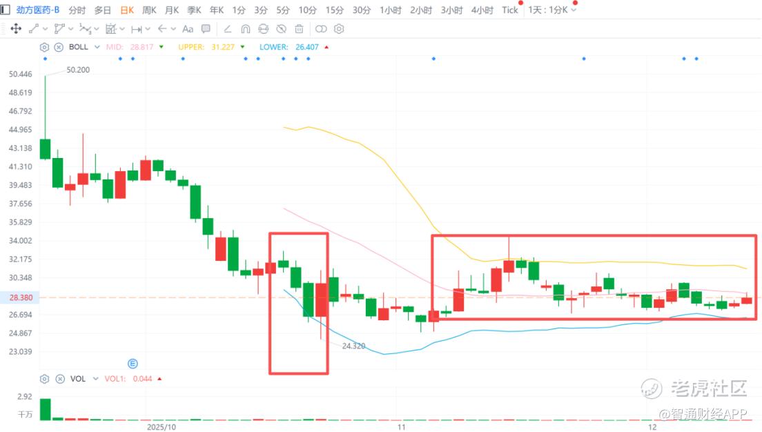 但在当时港股医药板块的震荡回调的行情背景下,较发行价翻倍的涨幅叠加当日冲高回落的表现,导致劲方医药在上市首日出现较大的场内分歧,并在后续出现了一段约1个月的股价下行区间。从9月19日至10月23日,其区间股价累跌幅度达到29.31%,股价最大振幅达到51.55%。