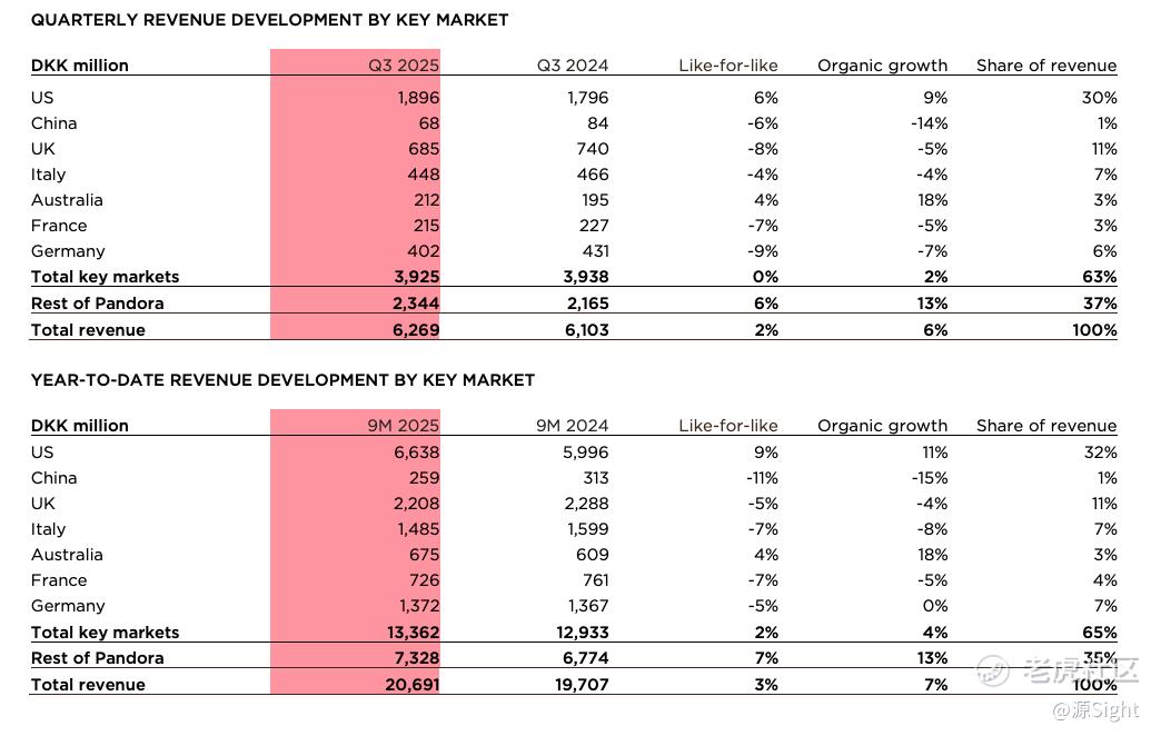 从业绩来看,潘多拉的收入依然十分稳健,虽然本季度的增长弱于2024年同期,但从2025年前三季度的整体情况来看,今年依然能完成7%-8%的有机增长。