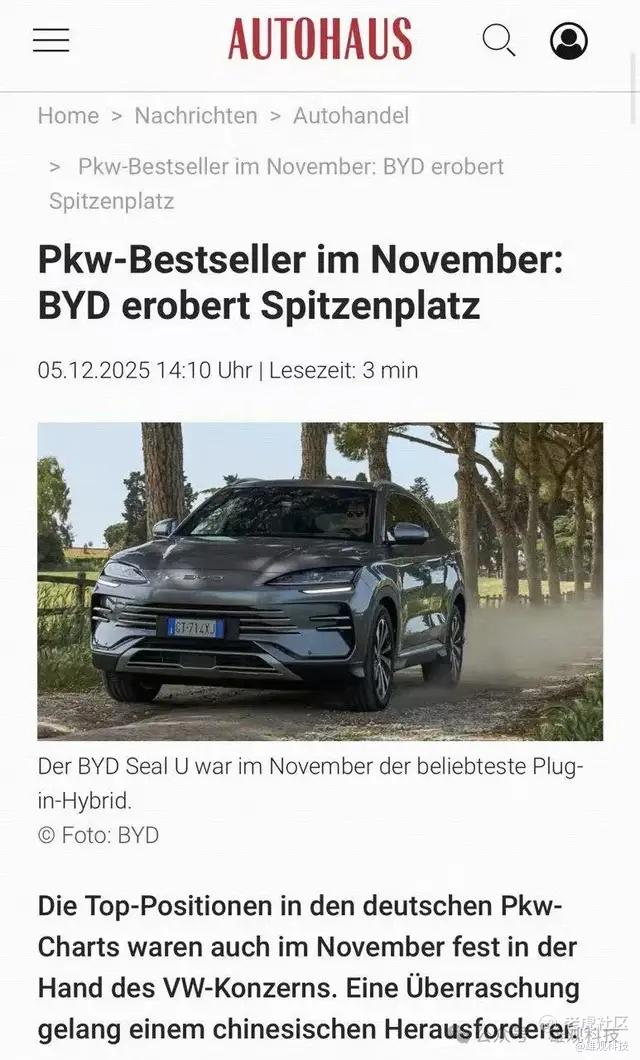 近日,BYD SEAL U(宋PLUS)成为德国11月车市插混车型销量冠军,引发行业广泛关注。这不仅是中国汽车品牌首次在德国主流细分市场登顶,更意味着比亚迪在欧洲的规模化突破已进入全新阶段。