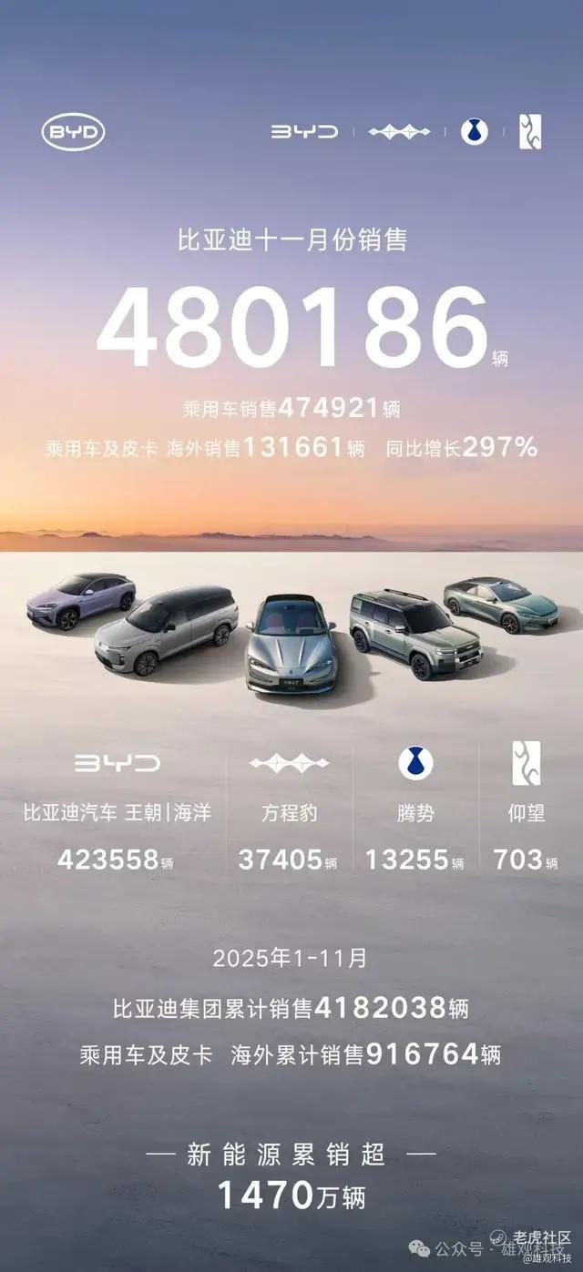 事实上,欧洲销量再创新高的背后,是比亚迪整个海外市场成绩的缩影。2025年1-11月,比亚迪乘用车及皮卡海外累计销量已突破91万辆;仅11月单月海外销售即达131,661辆,同比增长297%。比亚迪全球新能源汽车累计销量已超过1470万辆。