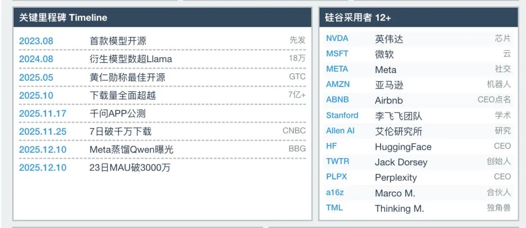看这个表单,你就知道硅谷有多少大佬和顶级公司在基于千问进行开发了,从黄仁勋到李飞飞,从Jack Dorsey到艾伦AI研究所,感觉他们的创业几乎都基于千问的衍生。中国开源模型已经成了全球AI创新的一种底层基础设施了,自打去年8月超过Llama之后就没歇过。