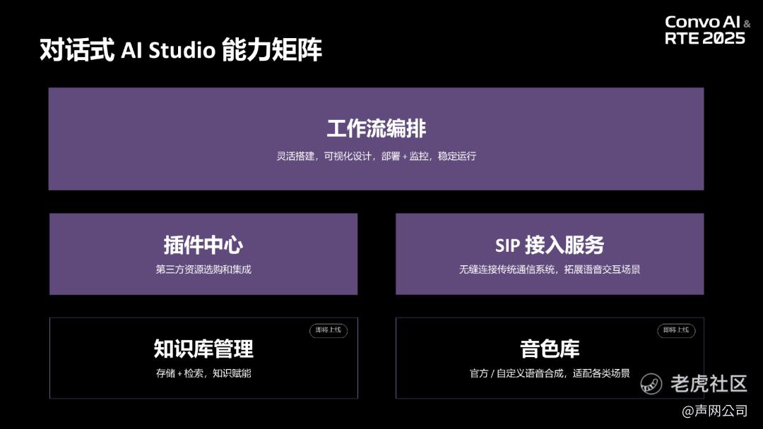 在对话式 AI 应用场景爆发的当下,开发门槛高、模型参数调优复杂、多供应商资源整合繁琐等行业痛点,成为了很多企业与开发者的烦恼。在 RTE2025 实时互联网大会上,声网正式发布了对话式 AI Studio 1.0,以 “零代码生产级智能体工厂” 为定位,直击行业痛点,凭借可视化编排、全流程模块化设计与生态化资源整合,让不懂代码、不熟悉音频参数的使用者也能在 1 小时内打造专属智能体,打破技术与效率的双重壁垒。