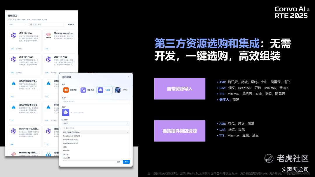 插件商店则实现了第三方资源的一键选购与集成,涵盖国内主流 ASR、LLM、TTS 供应商资源,用户无需挨个注册账号,通过声网即可完成一键选购,高效组装。同时支持自有资源导入,满足个性化需求。平台与声网对话式 AI 模型评测平台深度联动,可根据延迟、成本等核心指标为用户推荐最优模型组合,让选型更科学高效。