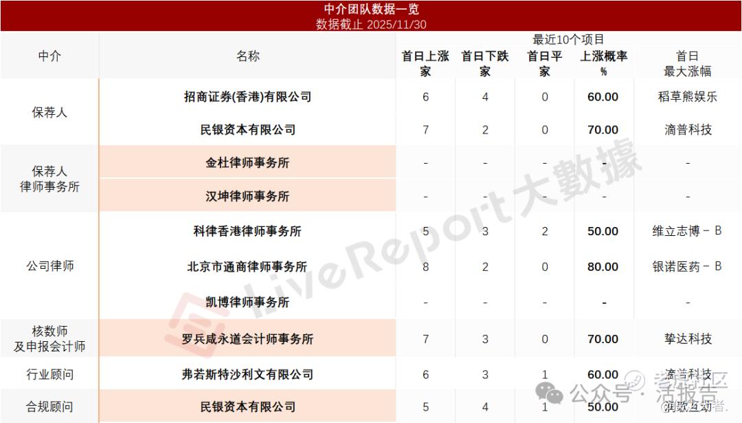 据**大数据统计,活力集团中介团队共计10家,其中保荐人2家,近10家保荐项目数据表现尚可;公司律师共计3家,综合项目数据表现不一。整体而言中介团队历史数据表现一般。