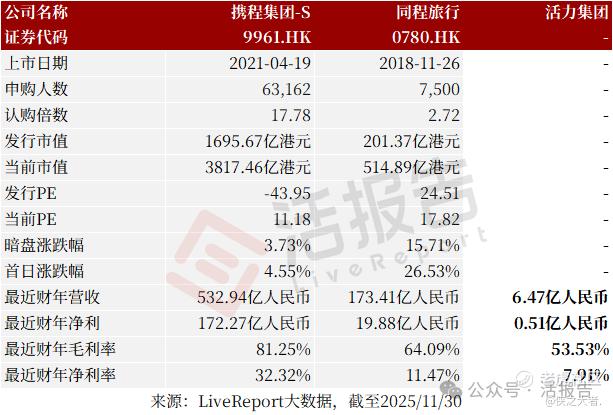 同行业IPO可比公司:携程集团、同程旅行