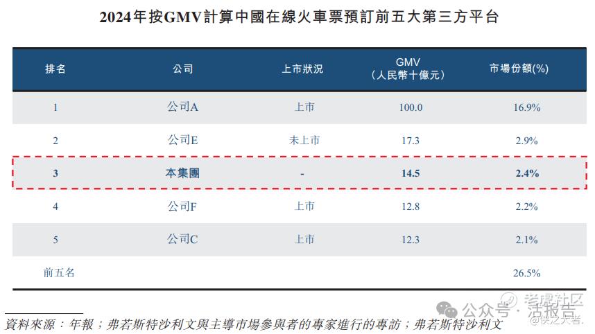 于2024年,按GMV计算,中国前五大第三方平台占在线火车票预订市场份额约26.5%,其中公司排名第三,GMV为人民币145亿元及市场份额约为2.4%。