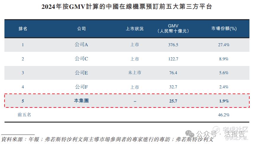 于2024年,按GMV计算,中国前五大第三方平台占在线机票预订市场份额约46.2%,其中公司排名第五,GMV为人民币257亿元及市场份额约为1.9%。