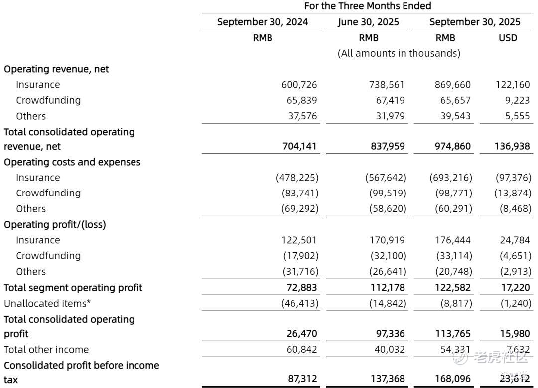水滴公司2025年第三季保险收入8.697亿(1.222亿美元),较2024年第三季度的6.007亿元增长44.8%,主要原因是技术服务收入的增长;其中,技术服务收入为1.964亿元(2760万美元),而2024年同期为1020万元。
