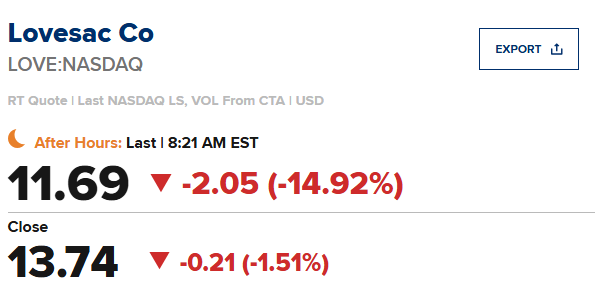 Lovesac (LOVE)第三季度每股亏损0.72美元,比市场预期值亏损(0.69美元)差0.03美元;营收同比增长0.2%至1.502亿美元,市场预期值1.5417亿美元。该公司预计第四季度每股收益为1.88- 2.22美元,市场预期值2.33美元;预计第四季度营业收入为2.36 - 2.56亿美元,市场预期值2.6047亿美元。
