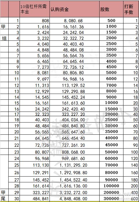 甲组的各档融资所需要的本金还有融资金额对应如下表: