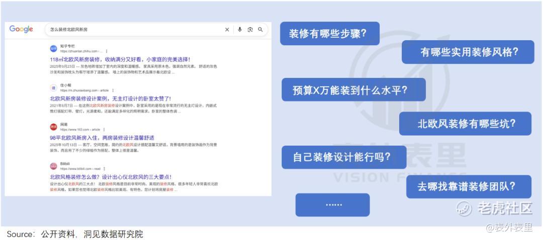 搜索“怎么装修北欧风新房”,返回的是一堆风格设计网页,想要了解更多装修步骤、技巧,得提炼关键词进一步搜索。最后可能要浏览上百个网页,才能拼凑出答案。