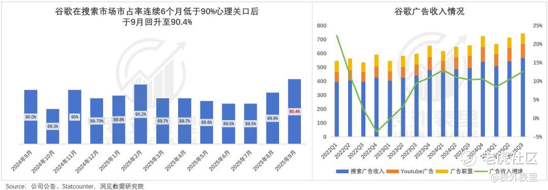 但冲击在这个夏天戛然而止。三季度,谷歌浏览器在搜索市场份额回升至90%,广告业务增速也止住了放缓趋势,连续两个季度加速增长。