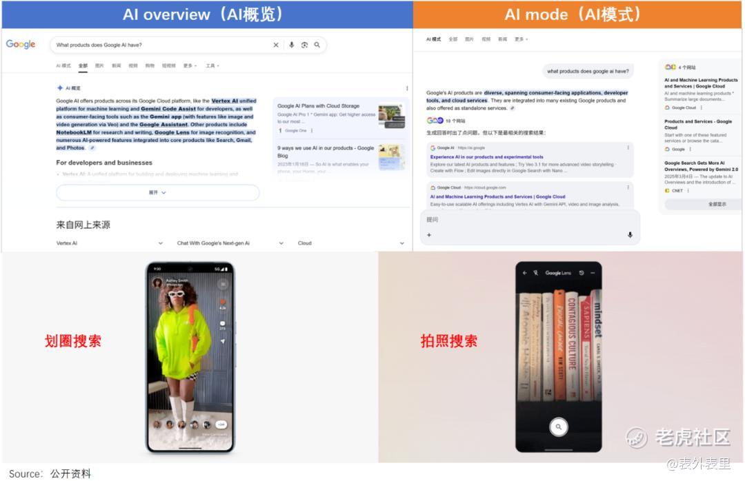 当然,它也没有躺赢。升级推出的“AI概览”和“AI模式”,都放在浏览器搜索栏附近,既不改变传统搜索习惯,用户懒得看网页时,又能随时调用AI。