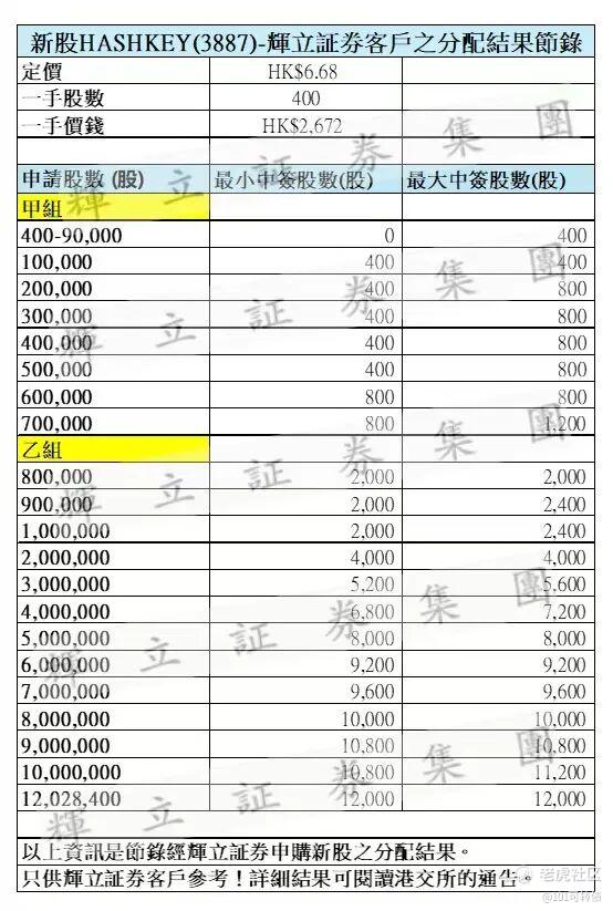 HashKey(3887)出分配结果了,250手稳中1手,甲尾2-3手,乙头5手;定价:6.68,偏上限定价了,一手400股;这个涨幅还真不好说,你们觉得是上天呢?还是入地呢?,具体分析可以看看上一篇文章,只做参考,不做投资买卖建议。