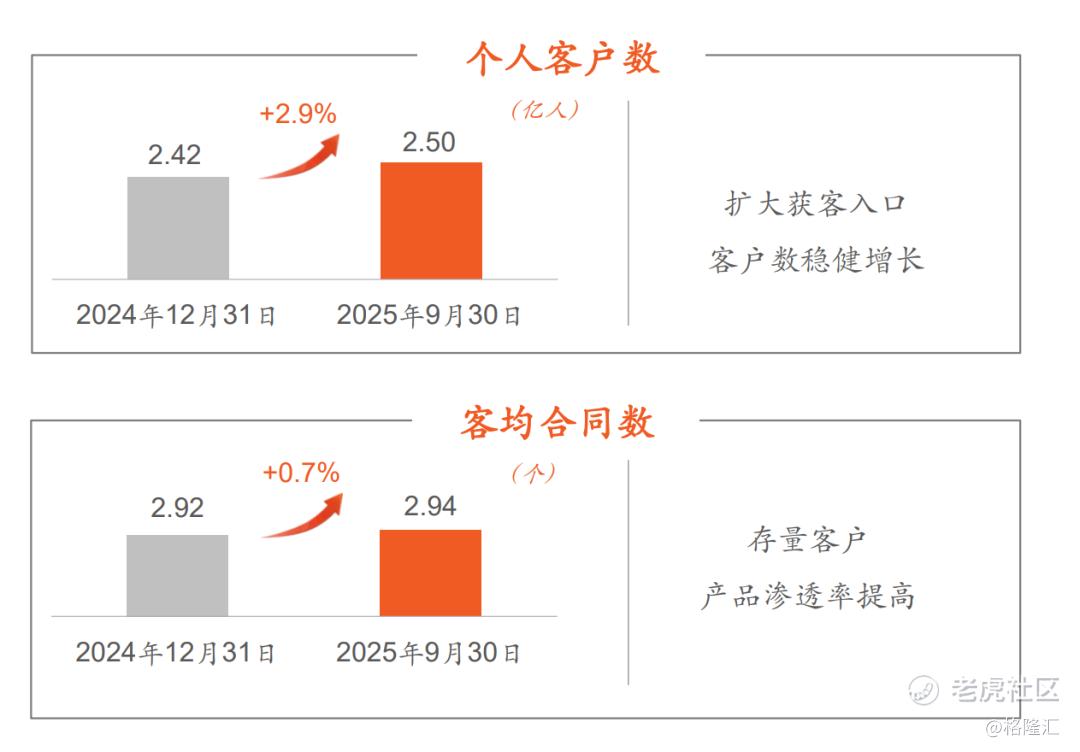 在综合金融端,平安以保险、银行、证券等多业务协同为基础,通过“一个客户、多个产品、一站式服务” 的模式,满足不同客户的多元化需求。截至2025年9月末,平安个人客户数近2.50亿,较年初增长 2.9%,其中持有集团内4个及以上合同的客户留存率达97.5%,服务时间5年及以上客户的留存率为94.4%。 $中国平安(02318)$