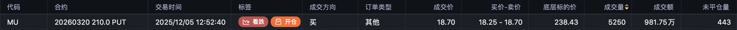 我觉得sell put那条腿不做也行,因为上周有大单buy put做空买入5250手 210put $MU 20260320 210.0 PUT$ ,成交额981万美元。感觉财报后美光也不免一跌。