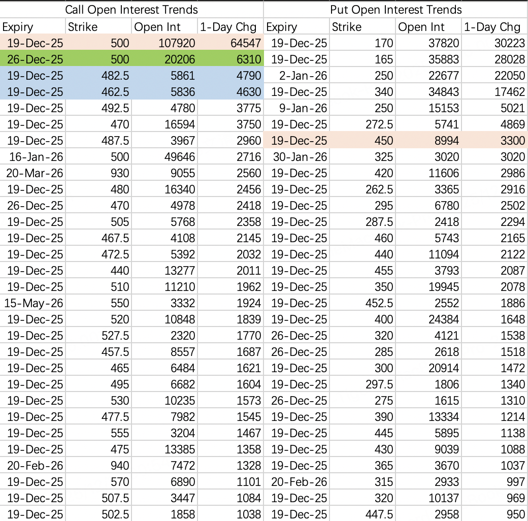 特斯拉周一行情比较激烈,主要钩子是本周到期500call开仓6.45万手 $TSLA 20251219 500.0 CALL$ ,未平仓量达到了10.79万手,非常客观,直接把机构的本周价差策略拉爆了:sell call $TSLA 20251219 462.5 CALL$ ,buy call $TSLA 20251219 482.5 CALL$